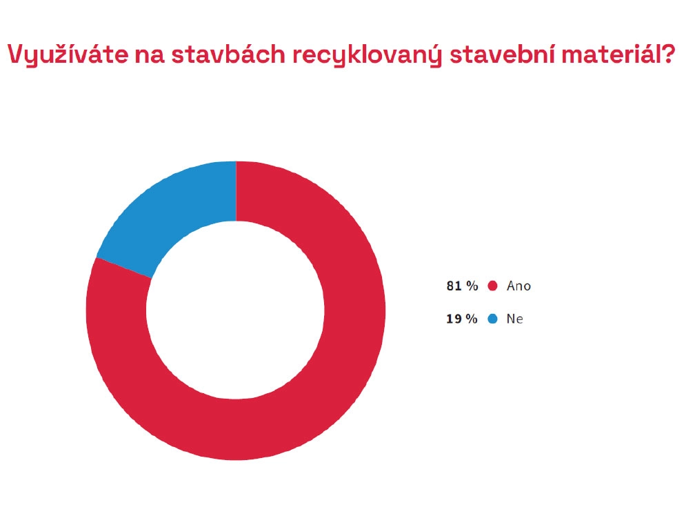 V současné chvíli na stavbách využívá recyklovaný stavební materiál 81 % z dotázaných společností, a to v průměru na 37 % všech svých staveb. Tento materiál nevyužívá pouze 19 % z dotázaných. Ze společností, které zatím recyklovaný stavební materiál na svých stavbách nevyužívají, má 40 v plánu začít tento materiál využívat v horizontu 3 let, 10 % pak v horizontu delším jak 3 roky a 5 % se ho chystá začít využívat v horizontu kratším než 1 rok. Naopak 45 % z dotázaných využití recyklovaného stavebního materiálu na svých stavbách v plánu vůbec nemá. Jiří Kozel, jednatel společnosti SWIETELSKY stavební s.r.o. se domnívá, že cesta recyklace je do budoucna pro stavební sektor nevyhnutelná: „Odpady likvidujeme nebo zpracováváme v souladu s platnou legislativou. V budoucnu se ale celé odvětví bude muset dát cestou recyklace. Zdroje přírodních surovin ubývají a náklady na skládkovné stavebního odpadu stále rostou. Recyklace je určitě jednou z cest, kterými se stavebnictví bude v blízké budoucnosti muset ubírat.“