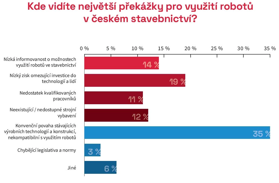 Jako největší překážku pro využití robotů v českém stavebnictví vidí ředitelé stavebních společností konvenční povahu stávajících výrobních technologií a konstrukcí nekompatibilních s využitím robotů (35 %). Jako další překážku vnímají nízký zisk omezující investice do technologií a lidí (19 %) nebo nízkou informovanost o možnostech využití robotů ve stavebnictví (14 %). Překážkami jsou také neexistující nebo nedostupné strojní vybavení (12 %), nedostatek kvalifikovaných pracovníků (11 %), chybějící legislativa a normy (3 %) nebo jiné než výše uvedené (6 %).