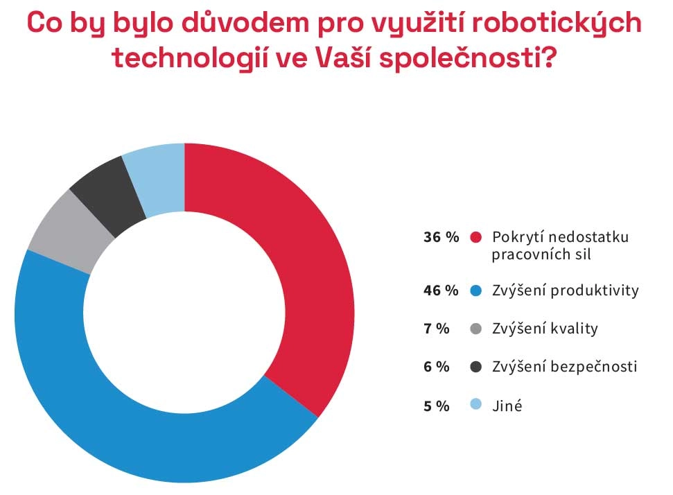 Pokud by se stavební společnosti rozhodly využít robotických technologií, činily by tak z důvodu zvýšení produktivity (46 %) nebo z důvodu pokrytí nedostatku pracovních sil (36 %). Již menší část dotázaných by potenciál viděla také ve zvýšení kvality (7 %) nebo zvýšení bezpečnosti (6 %). Největší podíl z dotázaných mají společnosti, které by byly ochotny do těchto technologií investovat 5–10 % ze svého zisku (37 %), nebo do 5 % ze svého zisku (34 %). Vyšší část zisku, a to do 15 %, by investovalo 11 % dotázaných, do 20 % zisku by investovalo 7 % dotázaných a větší podíl by investovalo 11 % ze všech dotázaných.